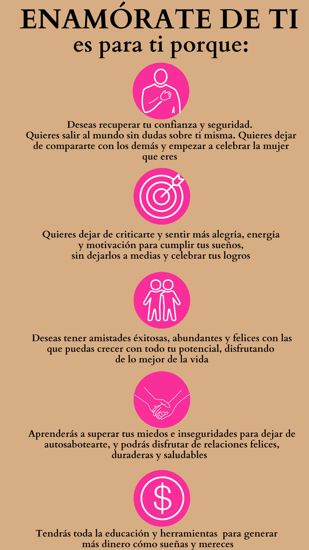 Mi compromiso contigo en estas 3 sesiones intensivas "Enamórate de ti " es guiarte en poderoso proceso de transformación hacia una vida plena, en dónde la tu autoestima y autoconfianza, sean tu nueva realidad.