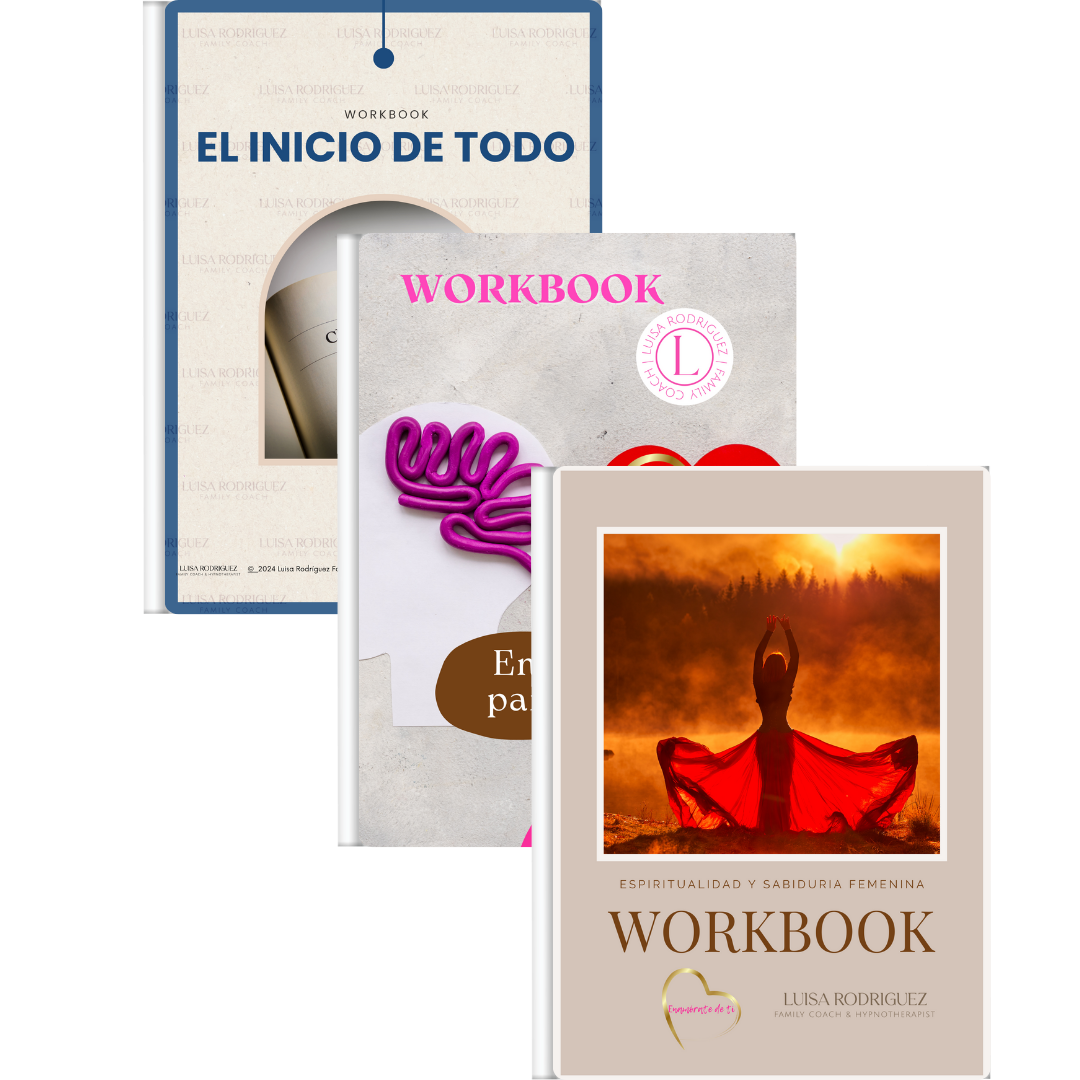 3 Libros de Trabajo diseñados específicamente para apoyar cada sesión. Estos libros son herramientas poderosas que te guiarán paso a paso en tu proceso de crecimiento y transformación personal.
